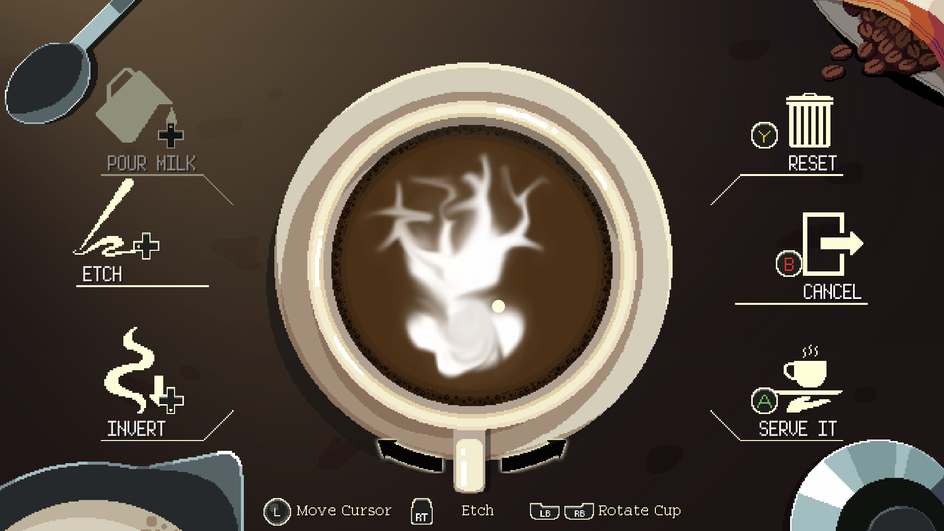 While the simple yet charming coffee brewing aspect of the game isn't necessarily the highlight as much as you would expect out of a game called 'Coffee Talk', it still acts as a solid pacing check as the player is required to make a drink based on a combination with 3 ingredients. Sometimes characters would ask for their "regular", other times they would give you niche suggestions as to what they want, for you then to surprise them with something new, and other times they would flat out tell you what they would like. It felt like another human way of interacting with the characters and trying to memorise combinations or drawing latte art did break up any potential monotony as you essientally read for a couple of hours. There is an endless mode where you can challenge yourself to fully remember all the drink combinations and how fast you can make them per the customers' satisfaction of "WARM, COLD, SWEET, BITTER", but the initial gameplay loop isn't anywhere near as engaging for you to enter the mode outside of some achievement hunting. Like I said earlier, you can do latte art which is quite nice and continues that relaxing flow of the game, but its achievement where you have to have an accumulative hour of drawing art is a pretty bold ask, especially if the atmosphere didn't click with you or you're not willing to sit there for an hour.