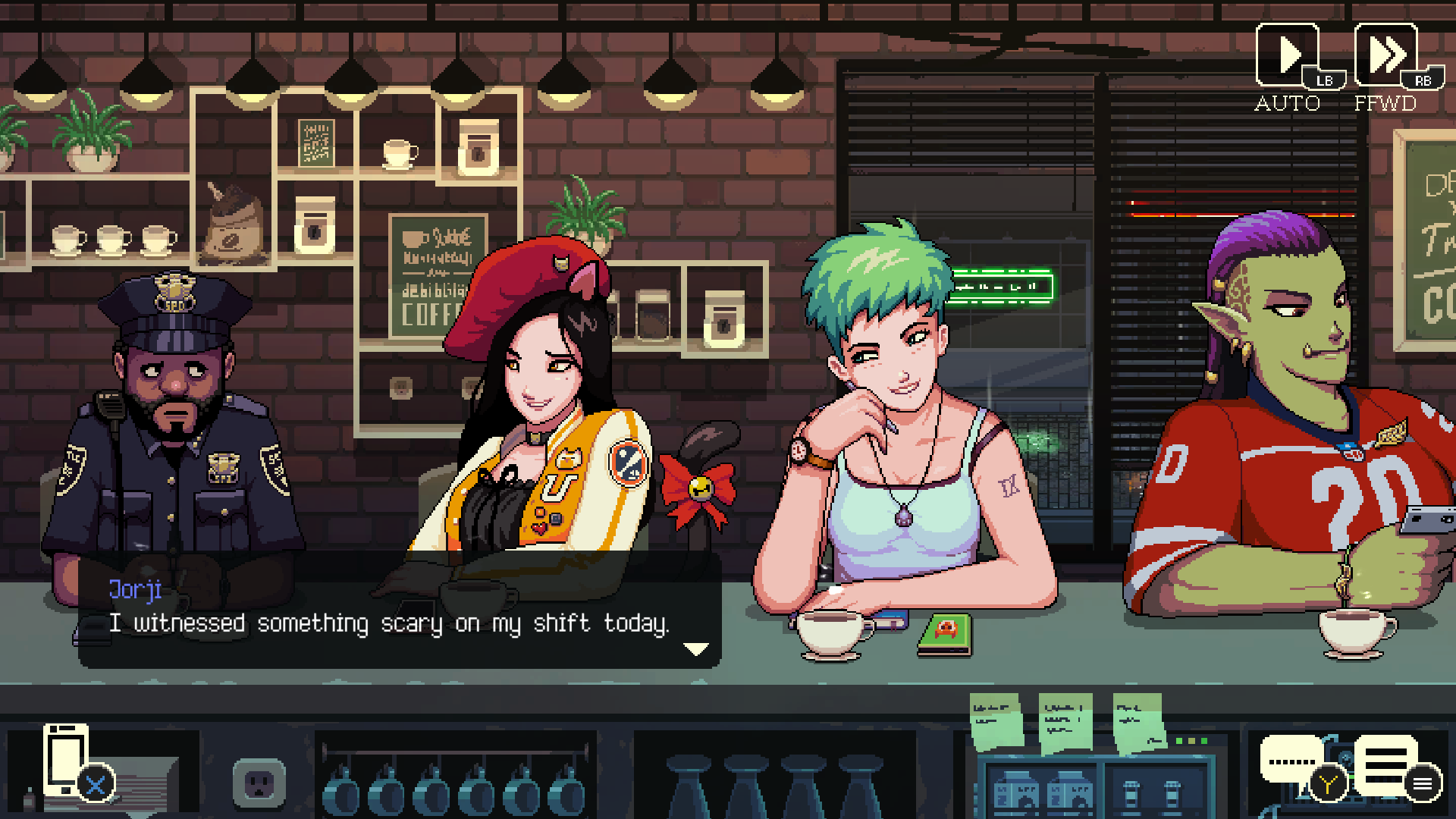The atmosphere is beautiful and soothing from stellar pixel art that breathes as much life into the world as it has details in every crack and crevice, to chill music that perfectly encapsulates that cafe vibe into a visual novel package. The pixel art really is incredible, as the attention to detail of making the characters dynamic and go on their phones whilst not part of a conversation, or reacting when overhearing someone, wasn't needed but further made the experience engaging. As for the soundtrack, the serene, lo-fi tone made the cosy interior even cosier compared to the game's outside rainy weather. It doesn't stand out on its own, but when coupled with the welcoming nature of the game's characters and the appealing art style, it makes for a great 4-hour story to watch while drinking a hot chocolate or coffee.