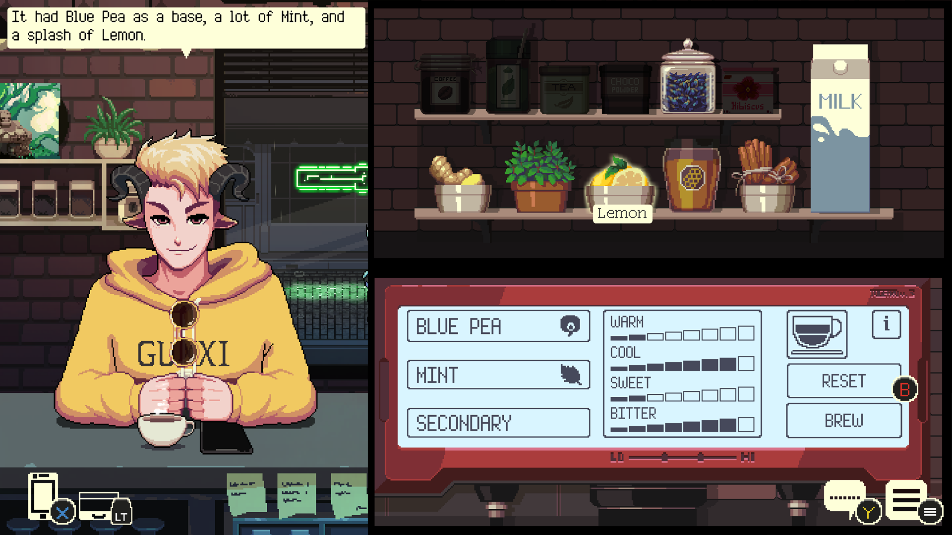 The gameplay faces issues and benefits similar to those of the narrative structure. It's the same. The only difference in this sequel is that there are two new ingredients you can experiment with; the Hibiscus and the Blue Pea. There is also the option to give items to customers when serving them their drink, and while this does have influence over some characters' storyline outcomes, the feature feels quite lowkey given how B-lining the main story and not using this mechanic results in something not too different from the "best" ending. Everything else; the latte art, the "WARM, COLD, SWEET, BITTER" endless mode, the regular drink serving; it's all the same. This lack of change gives me mixed feelings as on one hand, I wanted more so that I could engage with the game to a greater degree, on the other hand, it is a visual novel.